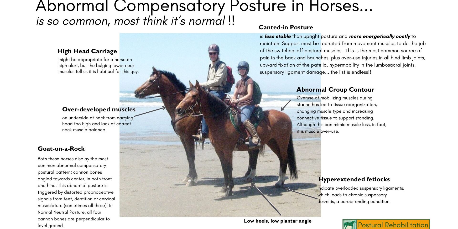 Postural Rehabilitation Professional is a 6 week, evidence based, high contact online program designed to teach equine professionals how to evaluate and remediate equine abnormal compensatory posture (ACP). Participants will learn about how standing posture is generated and controlled by the CNS, the peripheral structures critical to posture that tend to become distorted by domestication, how to recognize and remediate abnormal anatomic structures (distal limb/hoof, stomatognathic system) and function of the cervical spine to restore normal neutral posture to equine patients. We will also teach team-building among equine professionals, professional communications and how to apply injury forensics to chronic cases.